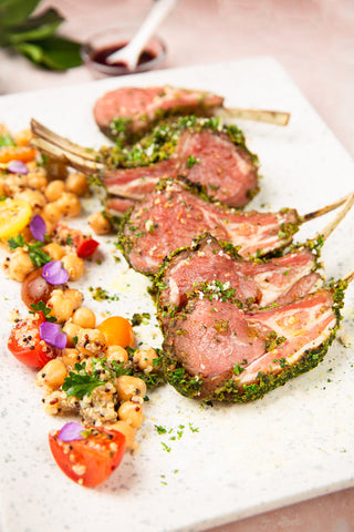 On high heat, heat oil in a skillet. Once hot, sear the lamb rack on both sides including the edges until golden brown. Remove from the pan, brush the lamb rack with Dijon mustard and dip in the green herb mixture. Ensure the herb mixture evenly covers the lamb. Bake the lamb in an oven at 325 °F (180 °C) for 3 minutes. Let the meat rest for 5 to 10 minutes. Slice and serve with quinoa, chickpeas, cherry tomatoes, and red onions.