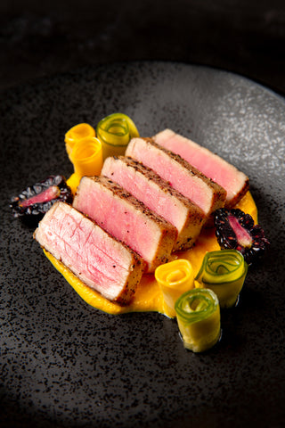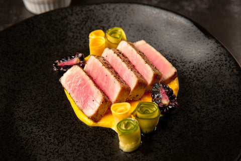 Season tuna with salt and black pepper. Place fillet into a sous vide bag. Seal the bag using a KitchenBoss vacuum sealer. Place the bag into the preheated water bath and let cook for 20 minutes.